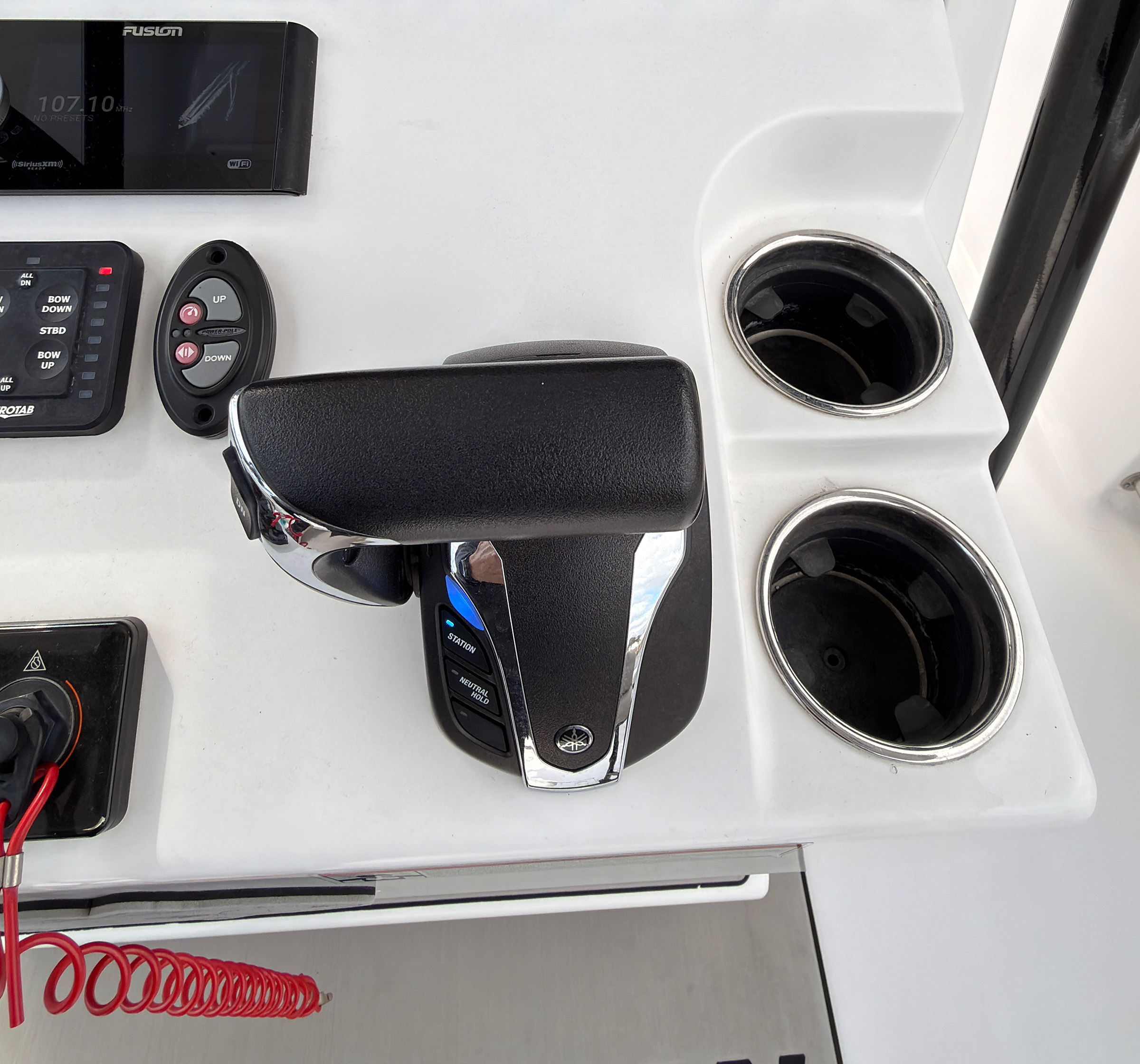 The helm features (dual Garmin displays), Yamaha digital controls, and a clean, ergonomic layout. Upholstery throughout the boat is in great condition, including the spacious bow seating with removable backrests.