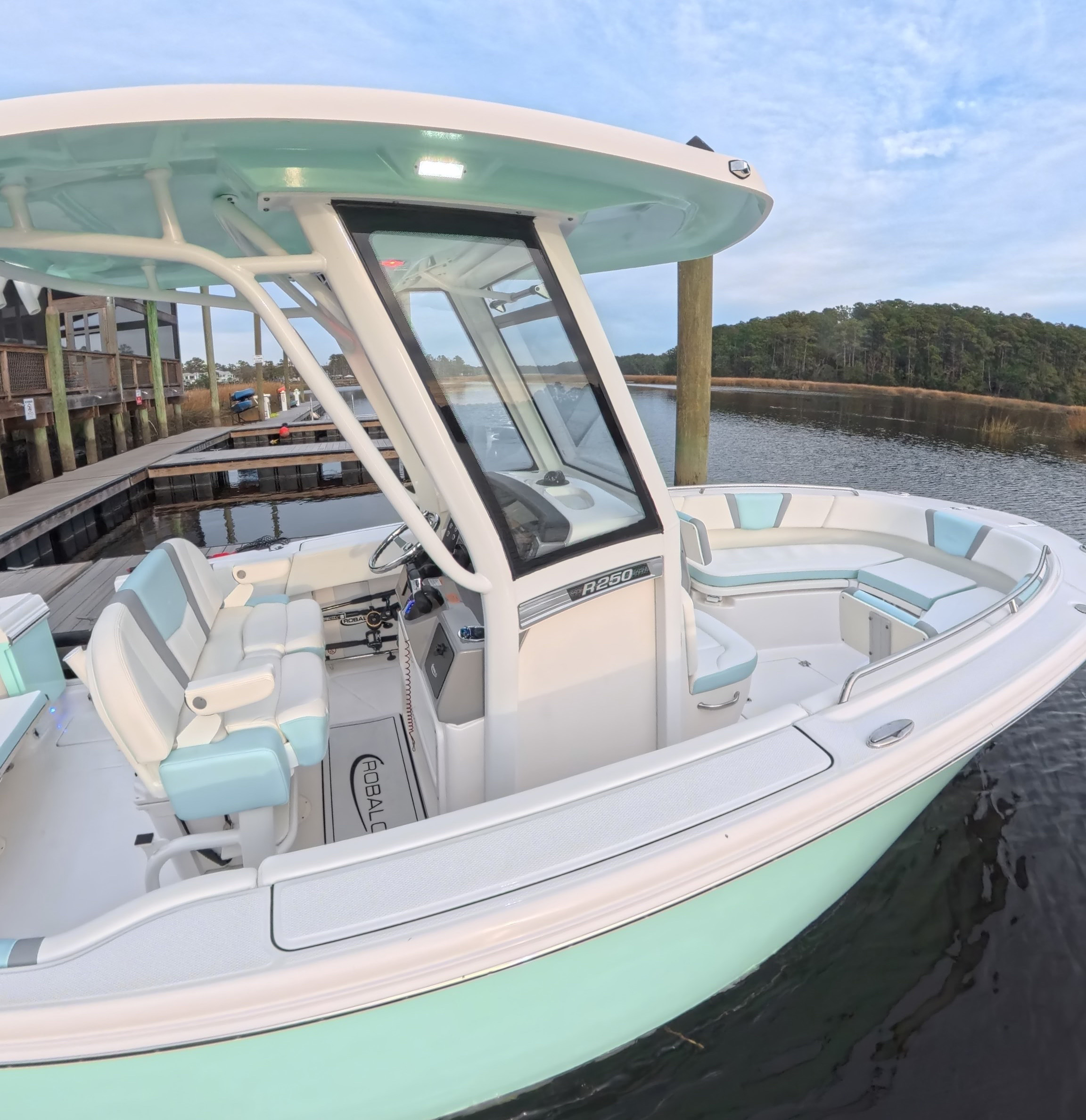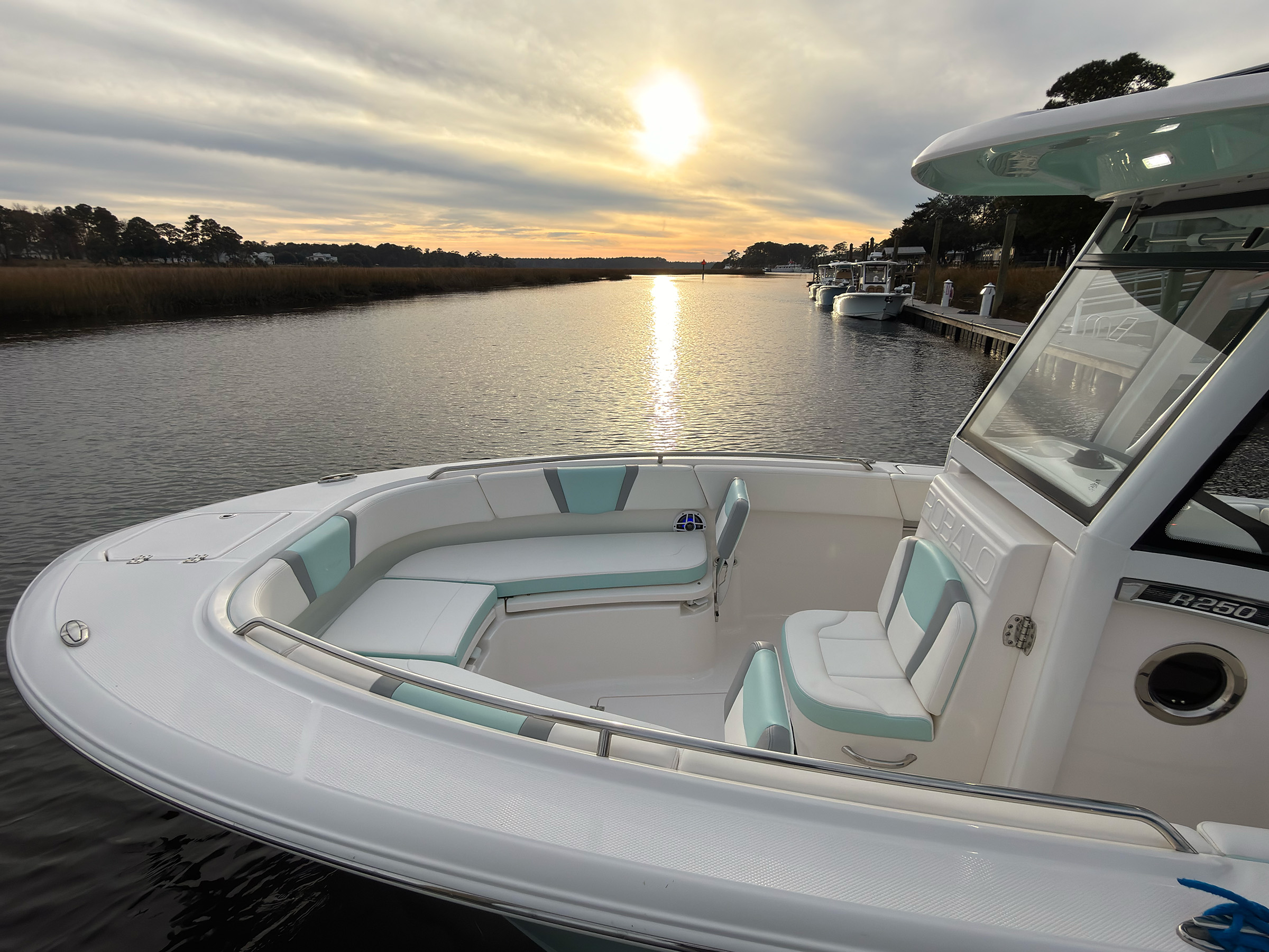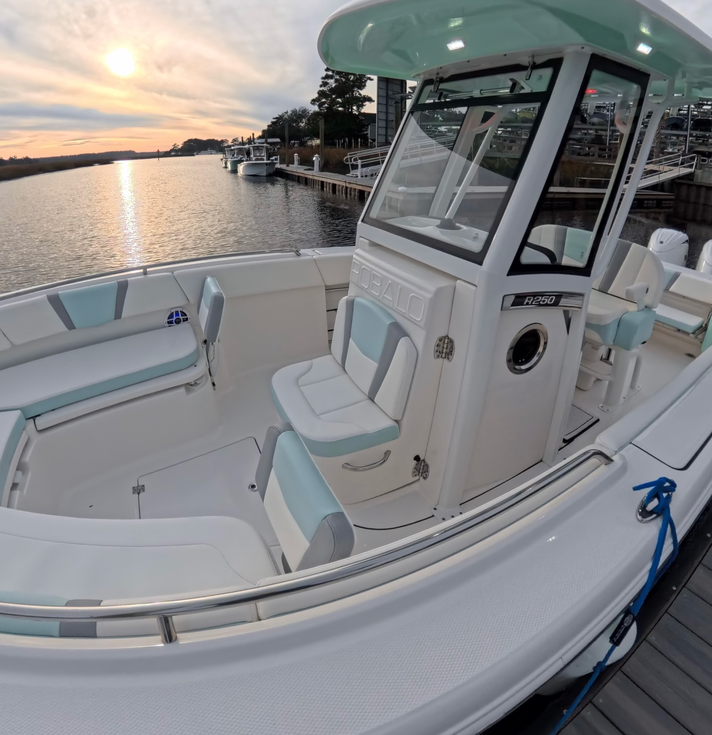Finished in a beautiful Sea Foam Green hull, this R250 features a factory hardtop, dual flush-mount electronics, wrap-around bow seating, convertible aft bench, and a fully enclosed head, making it perfect for both offshore runs and family cruising.