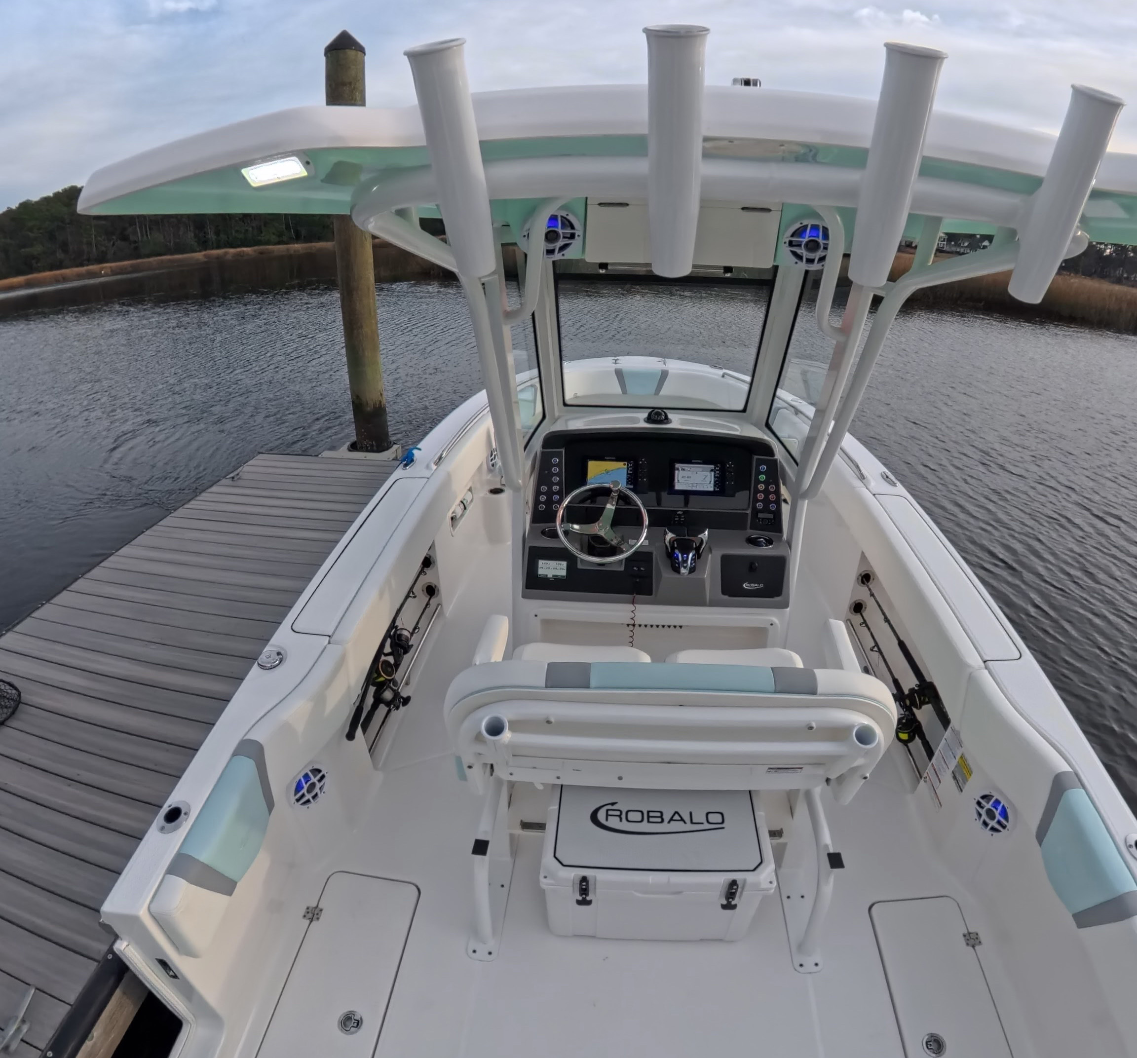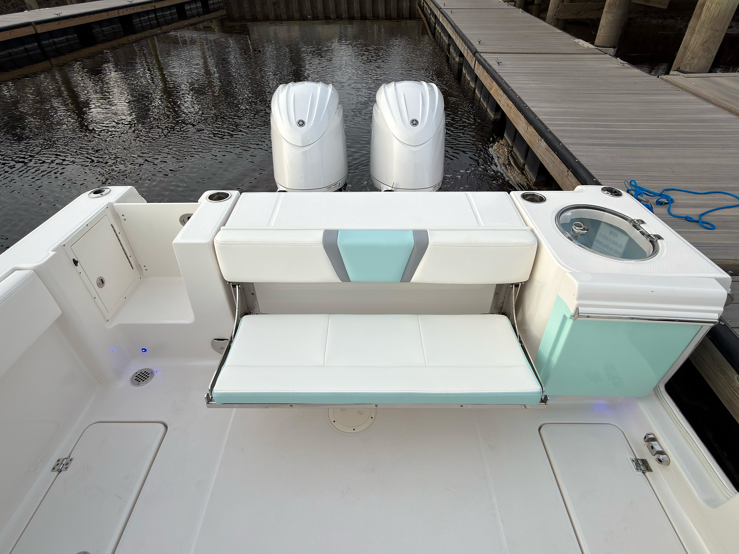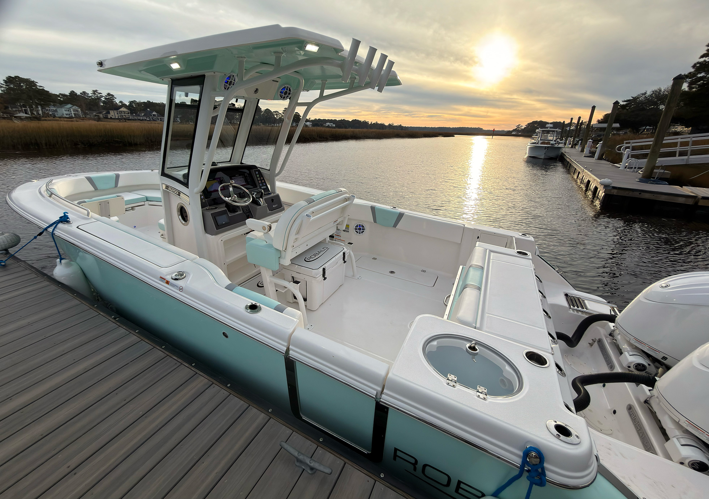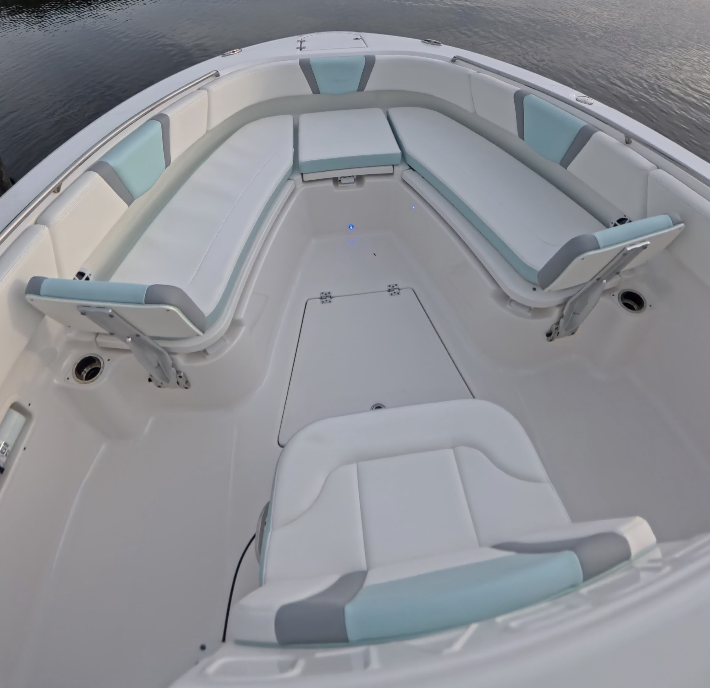 Finished in a beautiful Sea Foam Green hull, this R250 features a factory hardtop, dual flush-mount electronics, wrap-around bow seating, convertible aft bench, and a fully enclosed head, making it perfect for both offshore runs and family cruising.